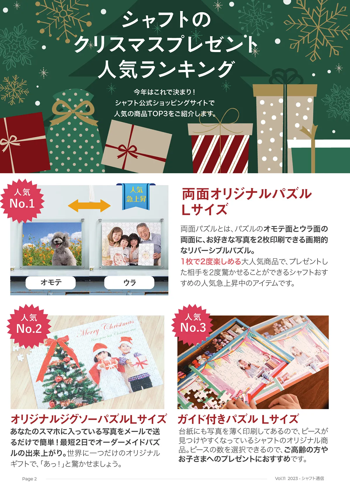 とびきりの写真を一枚選んで、相手を想って作ったシャフトのオリジナルパズルは、きっとあなたの大切な人に喜んでもらえるオンリーワンのクリスマスプレゼントになりますよ。