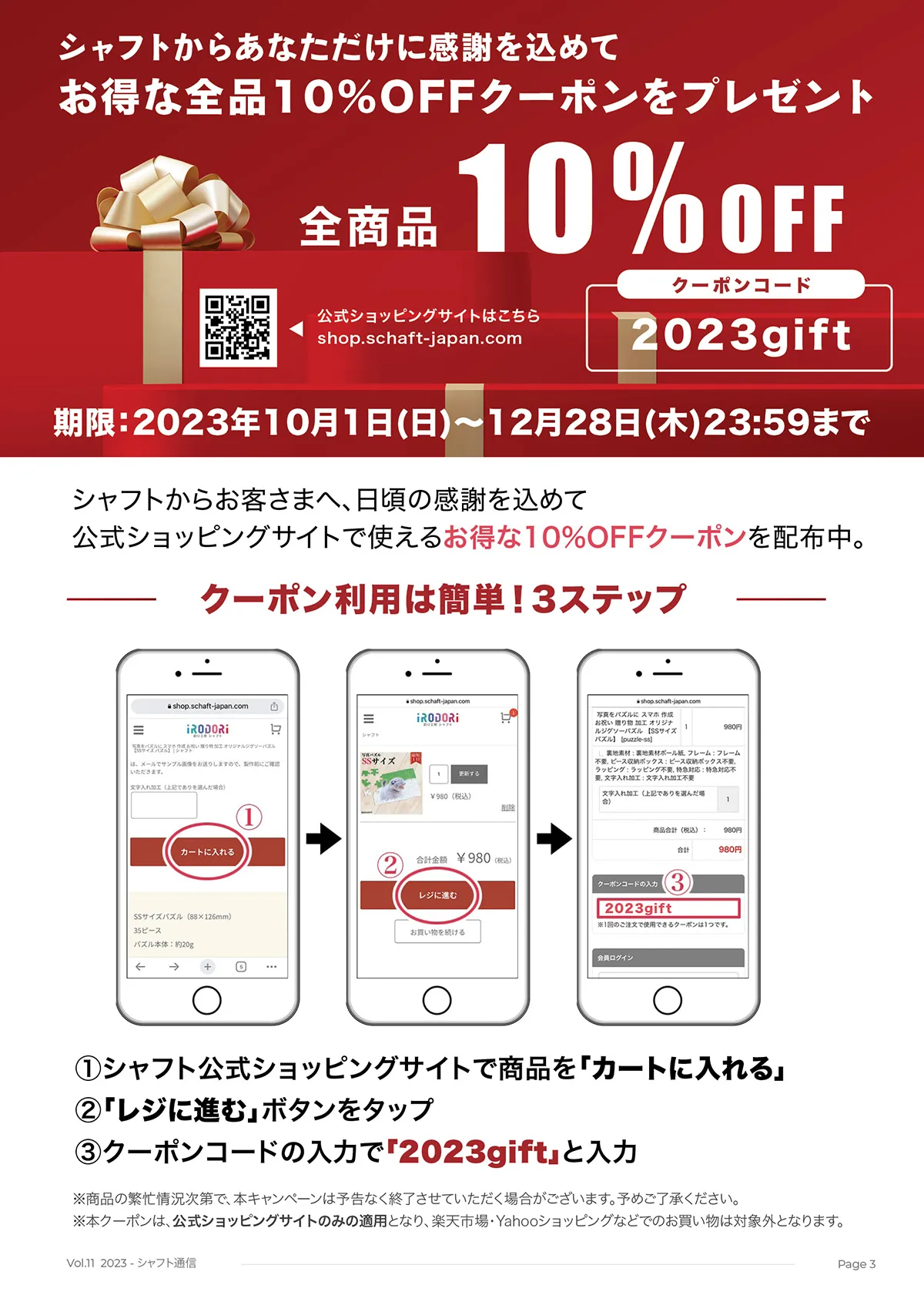 シャフトからお客さまへ、日頃の感謝を込めて公式ショッピングサイトで使えるお得な10%OFFクーポンを配布中。
