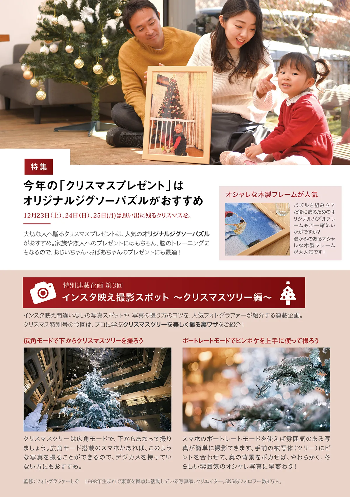 12月の一大イベントといえば、クリスマス!今年のクリスマスプレゼントはもうお決まりですか?どんなプレゼントが喜ばれるかわからない…贈り物がマンネリ気味…という方は、今年は思い出の写真を使ったパズルを作って、世界に一つのプレゼントを贈ってみませんか?